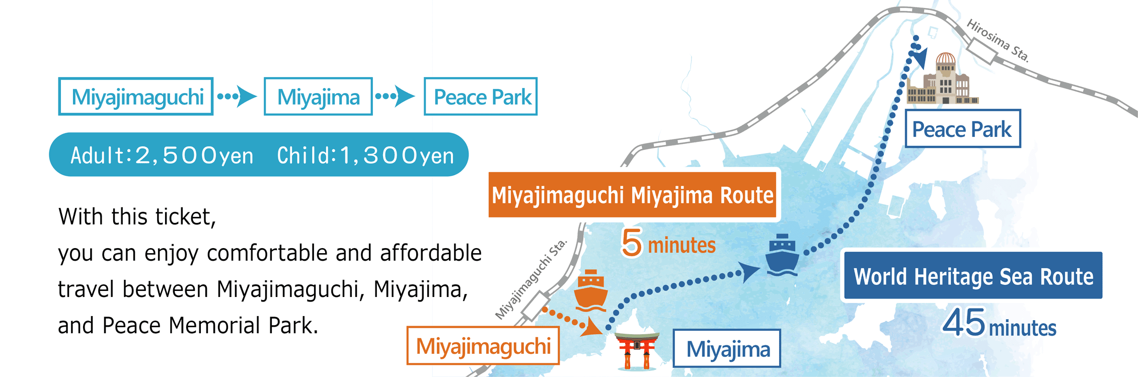 This package ticket combines the “Miyajimaguchi Miyajima Route” and the “World Heritage Sea Route,” allowing you to travel economically and conveniently between Miyajimaguchi, Miyajima, and Peace Memorial Park.