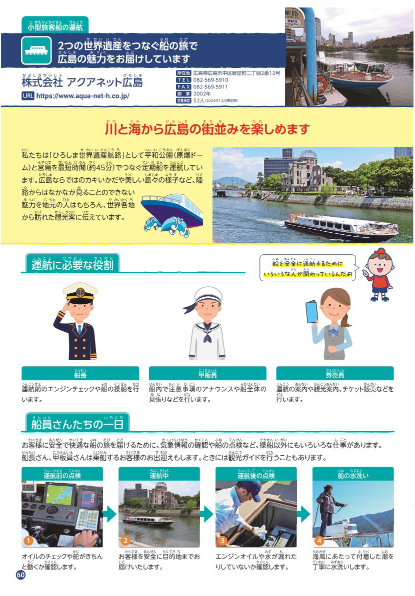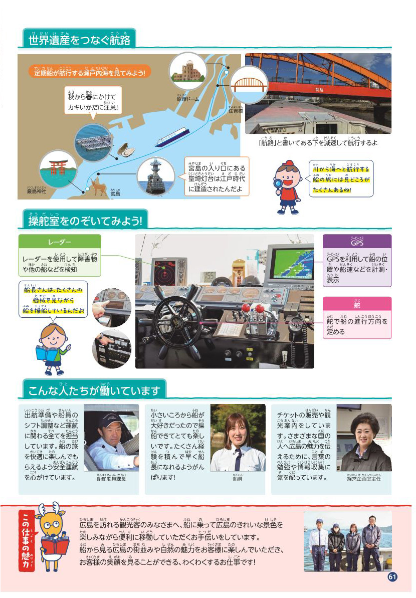 おしごと本は、子どもたちへの教育の場において、 地域ならではの産業や事業、仕事の魅力を伝え、地域愛を育んでいく地域学習などに活用してもらえるよう、広島都市圏エリア(広島市、廿日市市、府中町、海田町、坂町、熊野町)の小学校5年生を対象に無償で配布されている本です。瀬戸内海の資源活用や環境への興味、また水都ひろしまに密着した仕事として、弊社事業だけでなく運航事業に興味を持ってくれる子供が一人でも多く増えることを願っています。