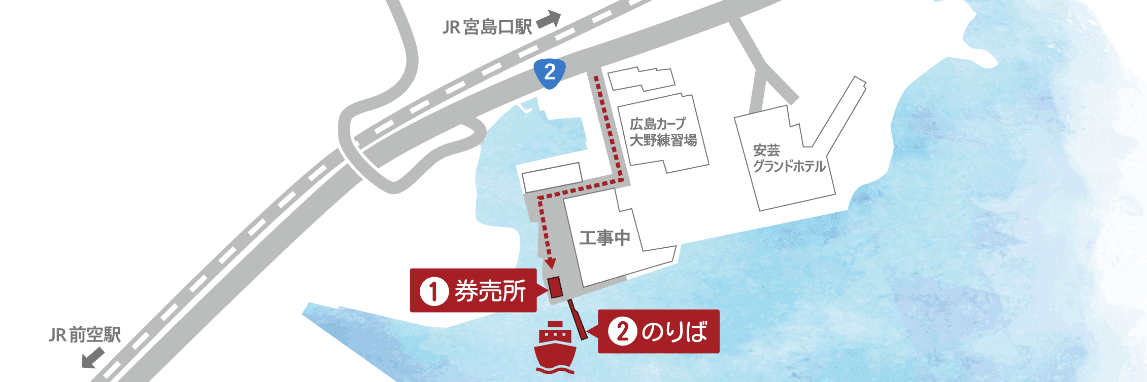 のりばは、前空駅から徒歩10分、宮島口駅から徒歩15分のところにあります。
