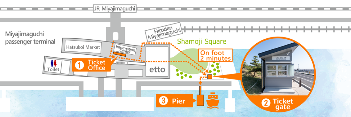 The ticket office is located inside the Miyajimaguchi Ferry Terminal, and the boarding platform is at the pier, about a 2-minute walk from the terminal.