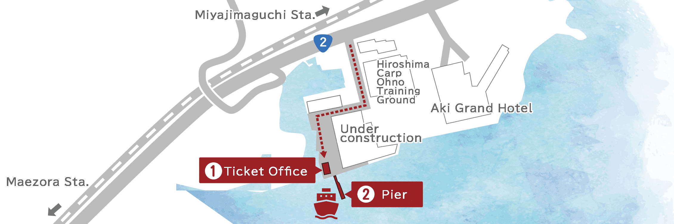 The Pier is a 10-minute walk from Maezora Station and a 15-minute walk from Miyajimaguchi Station.