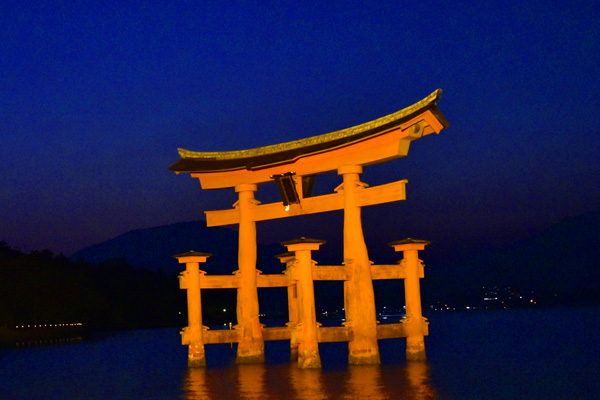 It depends on the time getting dark. Light which illuminates with Miyajima O-torii and Itsukushima shrine has a sensor.