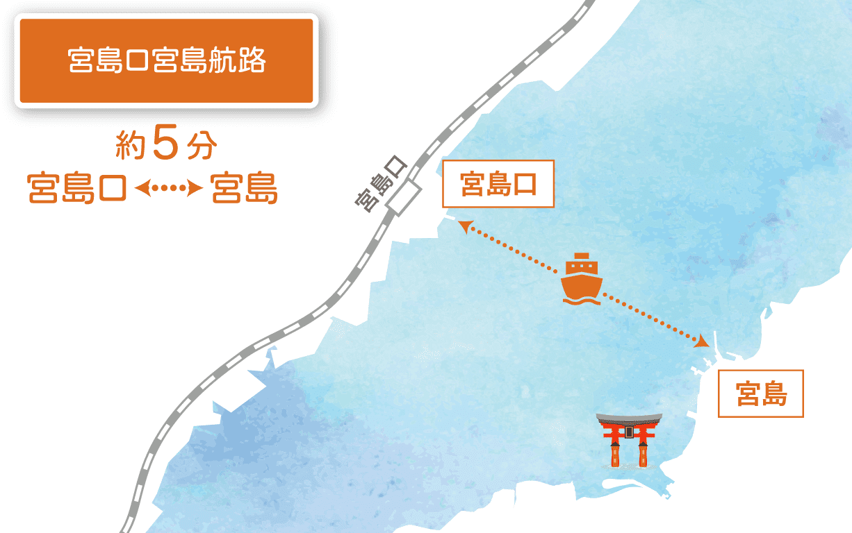 宮島口宮島航路は、宮島に船で渡るための玄関口「宮島口」と「宮島」を高速船(約5分)で結ぶ航路です。
