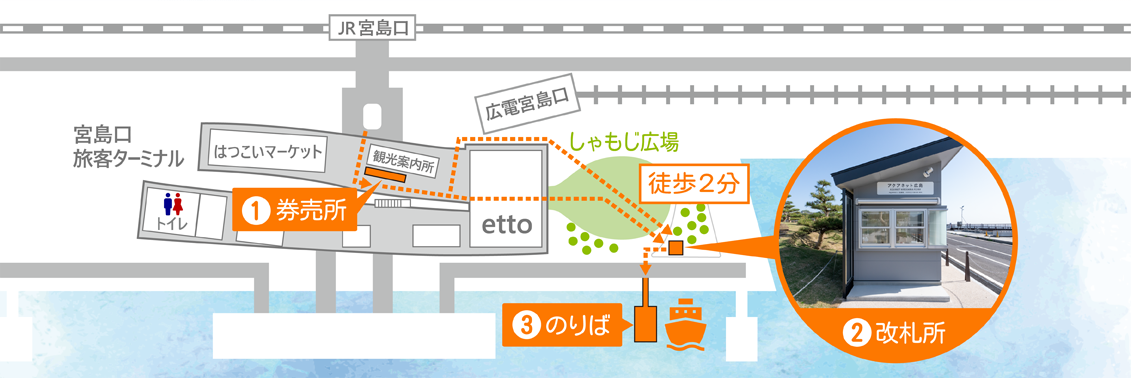 桟橋近くの券売所で受け付けしてください。(宮島口からの通しきっぷをご利用の方は、平和公園行きもこちらから出航いたします。)