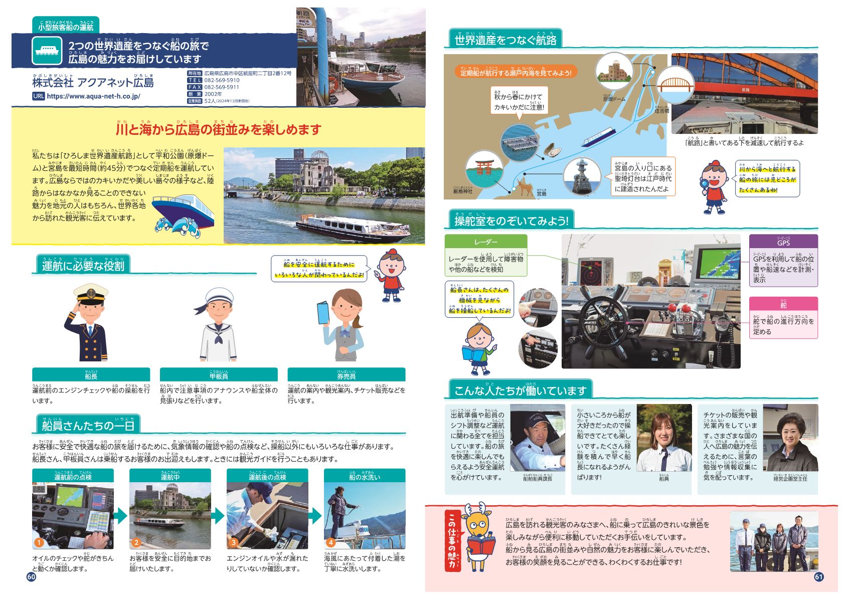 おしごと本は、子どもたちへの教育の場において、 地域ならではの産業や事業、仕事の魅力を伝え、地域愛を育んでいく地域学習などに活用してもらえるよう、広島都市圏エリア(広島市、廿日市市、府中町、海田町、坂町、熊野町)の小学校5年生を対象に無償で配布されている本です。瀬戸内海の資源活用や環境への興味、また水都ひろしまに密着した仕事として、弊社事業だけでなく運航事業に興味を持ってくれる子供が一人でも多く増えることを願っています。